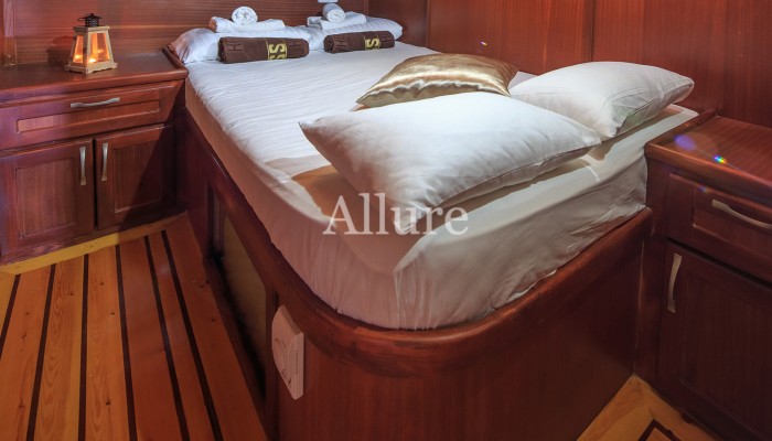 Delicious meals are served on the aft deck, which also features a cushioned platform where you can relax with a book. If you’re feeling more active, there is a wide choice of water sports equipment to choose from, including paddle boards, kayaks, and snorkeling gear. The Allure’s four experienced crew members go above and beyond to ensure a memorable adventure, no matter where you are headed.